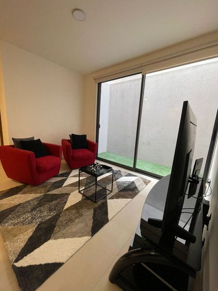 Sala de TV con salida a patio lateral privado, ideal para descansar o trabajar desde casa.