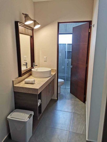 *Baños con canceles de vidrio templado de 10 mm, regaderas tipo SPA, cubiertas de marmol y detalles de madera