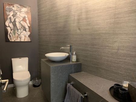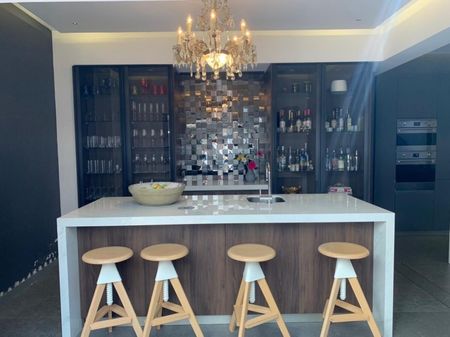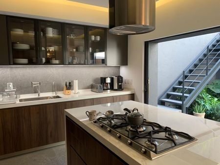 Cocina abierta súper moderna y equipada con una barra aparte de la que usas para cocinar, barra con bancos que hacen un bar maravilloso que da a otra terraza.