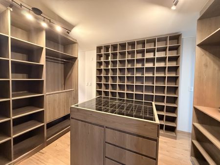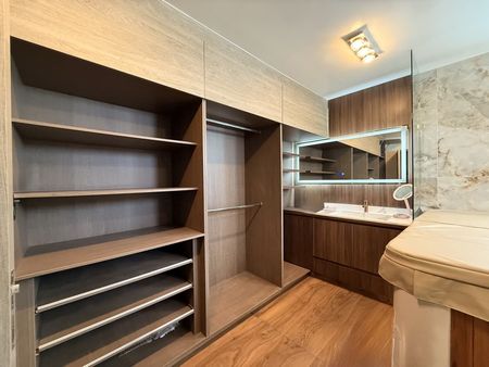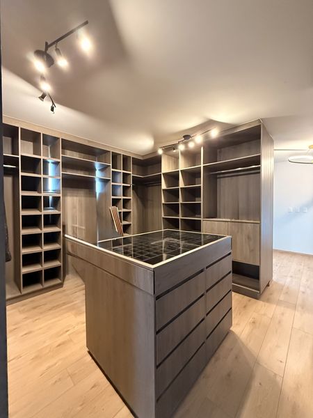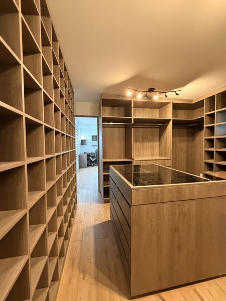 Sube al segundo nivel y descubre la sala de TV convertida en un vestidor gigante con almacenamiento infinito, perfecto para organizar tu vida con estilo.