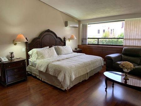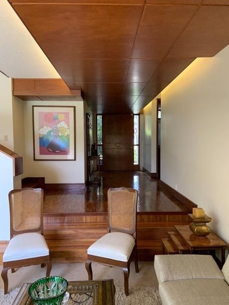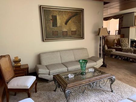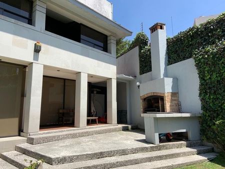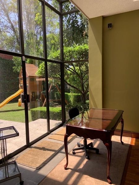 Antecomedor, cava, despacho, medio baño de visitas, terraza con jardín, cocina integral, 2 cuartos de servicio con baño, lavandería, 1 bodega y tres autos.