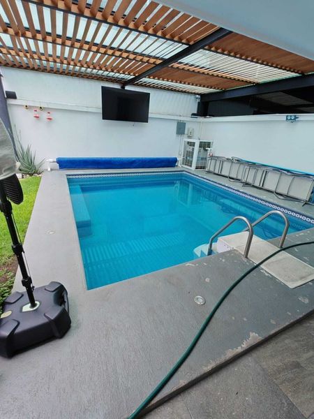 ALBERCA TECHADA CON PERGOLA DE CRISTAL TEMPLADO Y PANTALLA