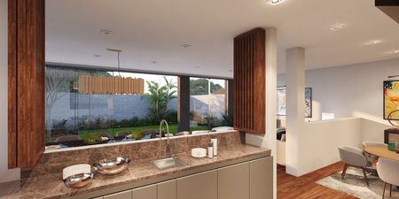 Diseño que considera tres recámaras todas con baño y la principal con vestidor , family room, sala y comedor con vista y acceso al Jardín de 66 m2, cocina abierta y baño para choferes, acceso directo al jardín.
