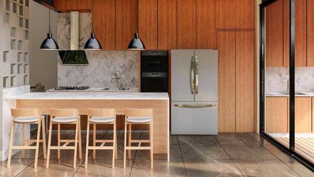 Cocina equipada (parrilla, campana, horno, microondas) con barra y desayunador con grandes vistas hacia las amenidades