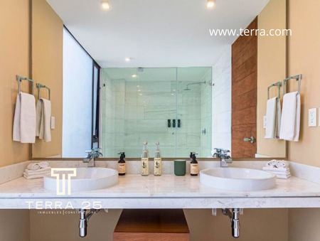 La propiedad cuenta con 3 amplias recámaras, cada una con baño completo, finos acabados en mármol y madera, que aportan un estilo sofisticado y de alta gama. La cocina, moderna y funcional, incluye un área que puede adaptarse como desayunador, family room o incluso oficina en casa.