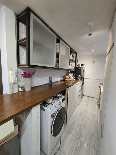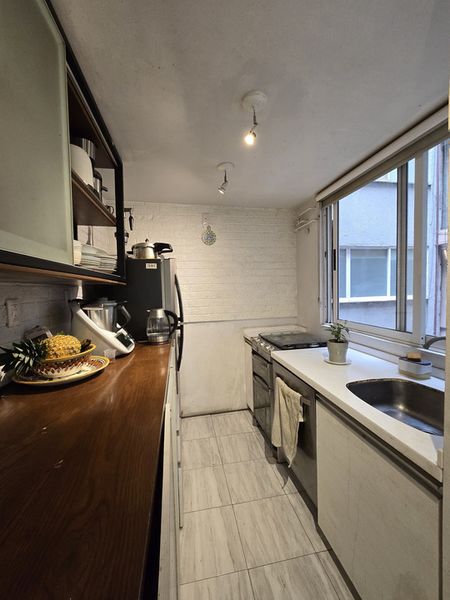La cocina que te recibe es abierta, con buena capacidad de almacenamiento y oportunidad de rediseñarla a tu gusto.
