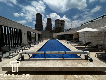 Amenidades de lujo: relájate en el spa, disfruta de la alberca, roof garden con fire pit, pista de jogging, grills, jacuzzi, gimnasio equipado y un juice bar para tu comodidad y bienestar.