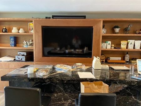 Comedor, sala, family con un bar con cubierta de mármol y mueble empotrado para copas vasos y tv. Baño visitas, vestíbulo, 2 balcones, Cocina integral, cuarto de servicio y lavandería.