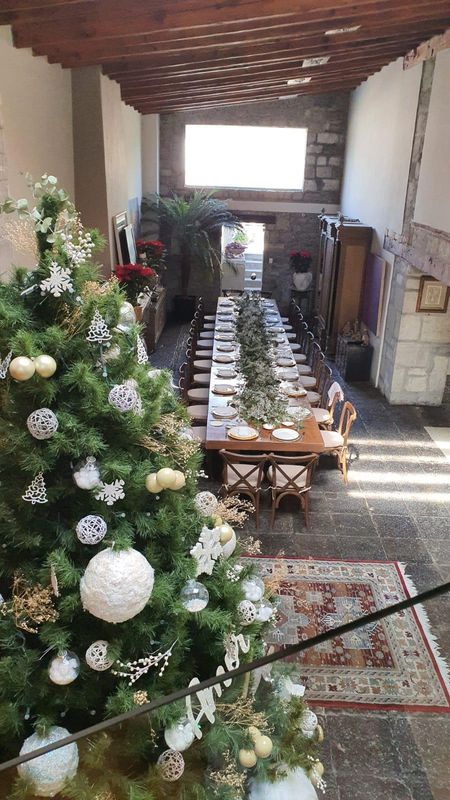 Tiene un gran hall con doble altura y una espectacular chimenea, grandes salas y comedor con vigas de madera antiguas y columnas y pisos de cantera, una biblioteca, y family room o sala de tv o cine preciosa.