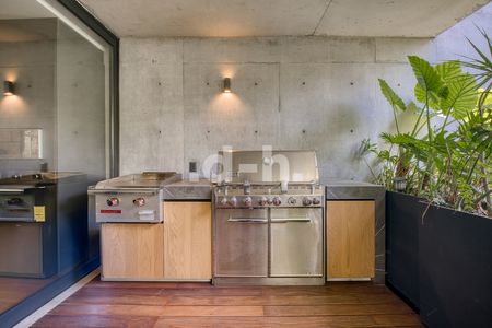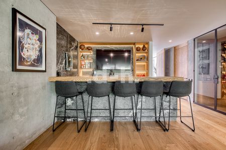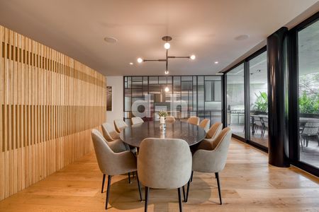 La sala-comedor se abre con ventanales hacia la terraza de 60 m², integrándose también con la cocina totalmente equipada, que se conecta mediante puertas al área social. El departamento cuenta con cuarto de servicio y lavandería, pisos de madera, y aire acondicionado en las recámaras, asegurando confort en cada rincón.