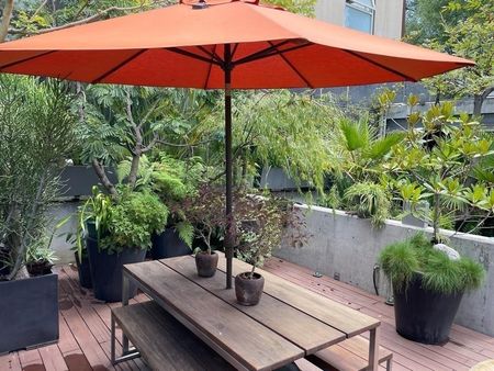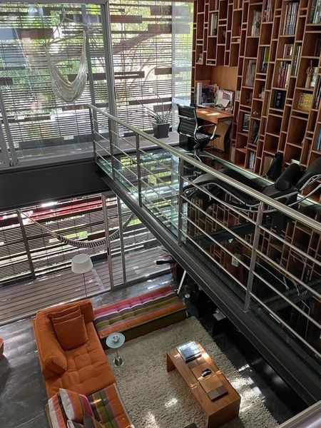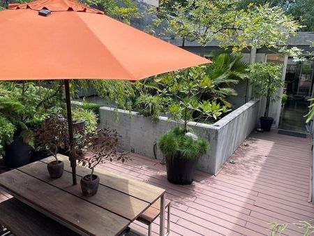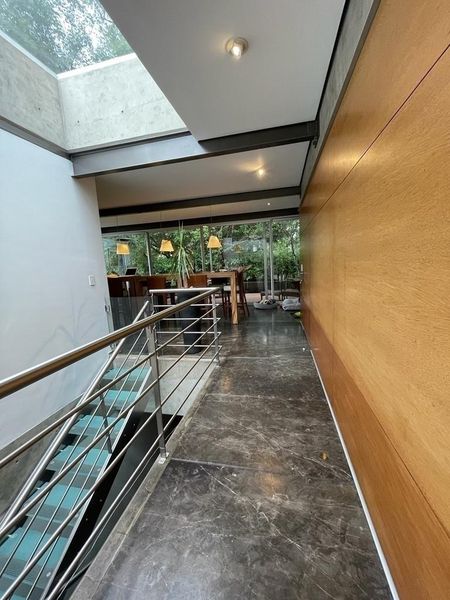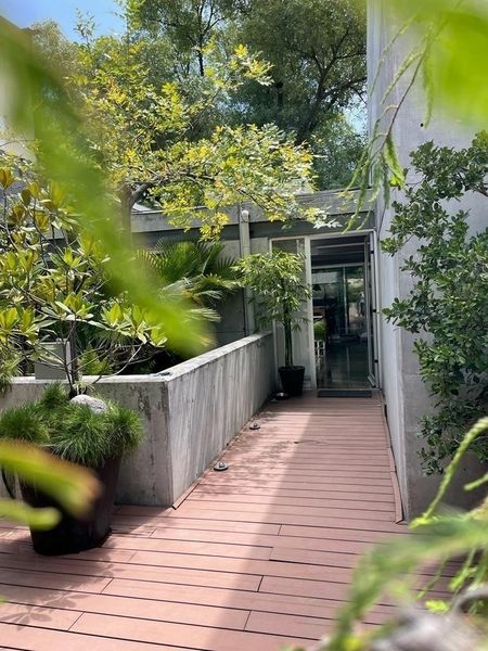 Se encuentra ubicado el comedor que da a una terraza exterior rodeada de árboles que proporciona privacidad .