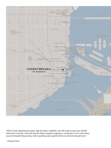 Viceroy Brickell es una imponente torre de vidrio de 45 pisos ubicada en la prestigiosa entrada de Brickell Avenue, frente al Miami River. Con 442 residencias de diseño exclusivo, incluyendo lujosos penthouses y apartamentos de la ciudad, este desarrollo ofrece vistas inigualables del vibrante estilo de vida urbano de Brickell, la Bahía Biscayne.
