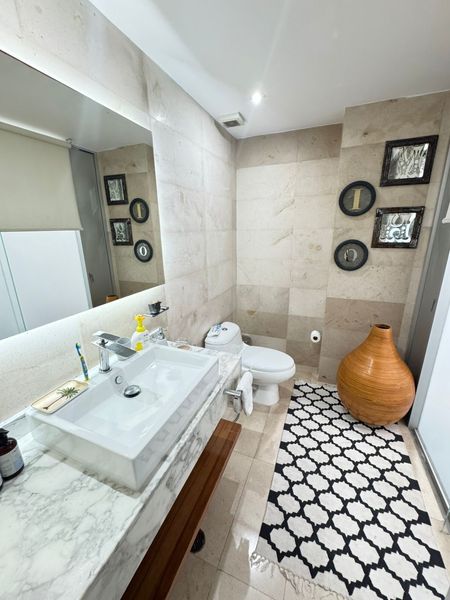 La carpintería de los closets y muebles empotrados de baño es madera y las cubiertas mármol