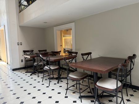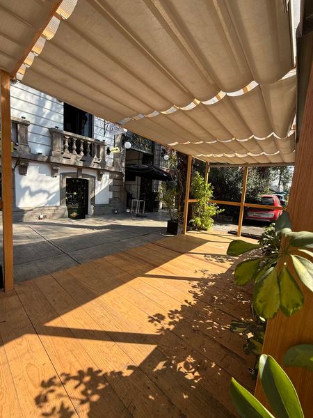 Planta Baja en Casa Porfiriana, cuenta con salon a pie de calle, mesas en el lobby de la casa y terraza con pergola.
