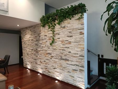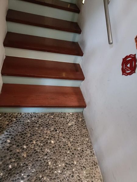 En el 1er piso tiene gran estancia con balcón para sala y comedor , cocina integral cerrada y medio baño de visitas. Medio piso arriba se encuentran las 2 recámaras secundarias con closet que comparten el baño completo.