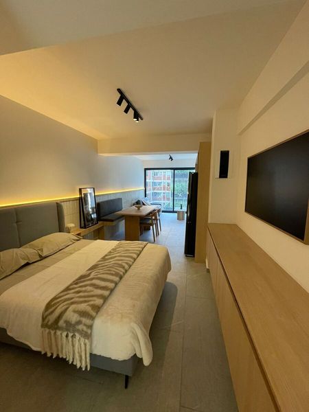 Cuenta con cocina equipada, baño, espacio de sala comedor y dormitorio integrado. Tiene un lugar de estacionamiento que se maneja con valet parking. La vista es hacia el Bosque de Chapultepec.