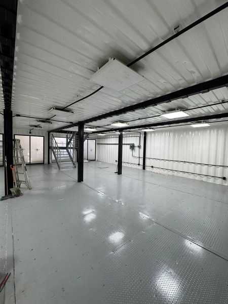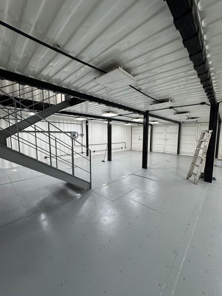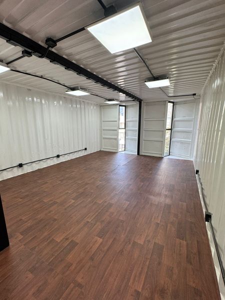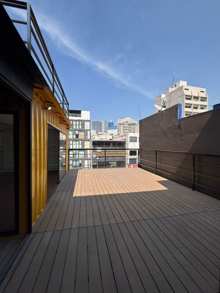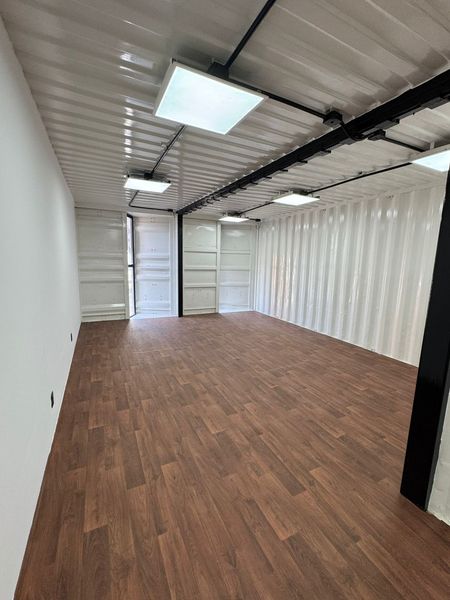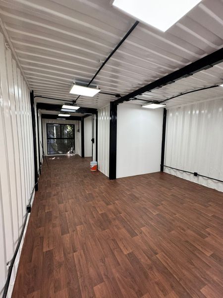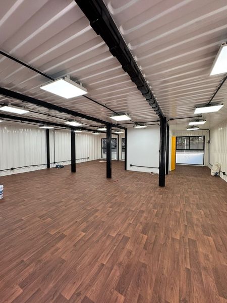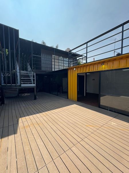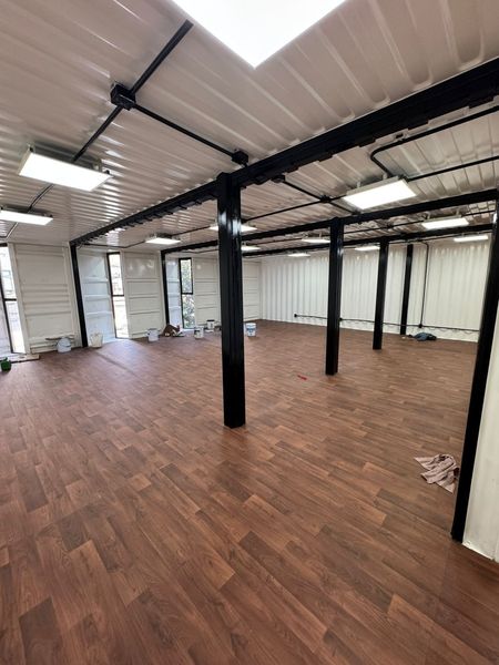 Construido enteramente a partir de contenedores industriales de doble altura, este espacio de 543 m² se distribuye de la siguiente manera: