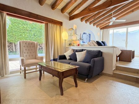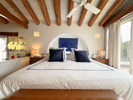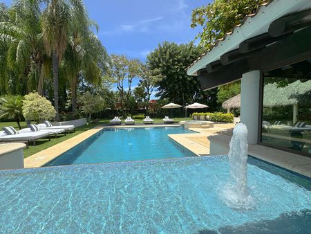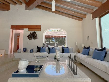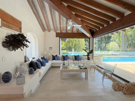La sala y el comedor están iluminados naturalmente y ofrecen impresionantes vistas a los jardines de la propiedad. En el exterior, encontramos varios espacios de ocio para toda la familia, incluyendo una alberca y un jacuzzi de hidromasaje al aire libre. Salas de estar, espacio para cenas a la luz de la luna.