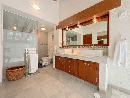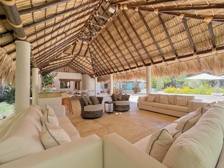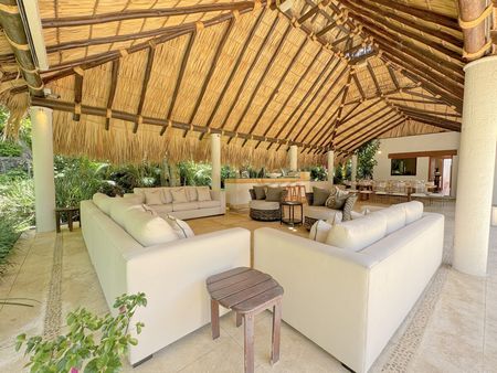 También hay una gran palapa con barra, dos salas exteriores y un comedor para 14 personas, ideales para disfrutar momentos inolvidables con familiares y amigos. La cocina integral está equipada con todo lo necesario para atender a tus invitados, y la propiedad incluye dos cuartos de servicio.