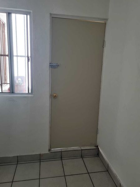 Cuarto de lavado con mueble de almacenamiento. Puerta principal con chapa de seguridad.