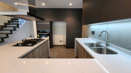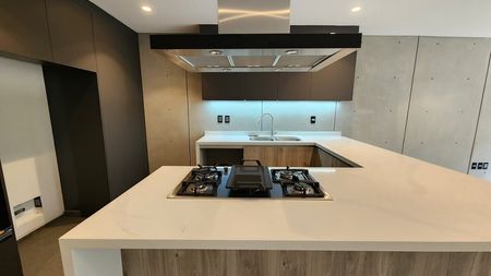 Cocina de alta gama, equipada con electrodomésticos de última generación, isla central y acabados en cuarzo.