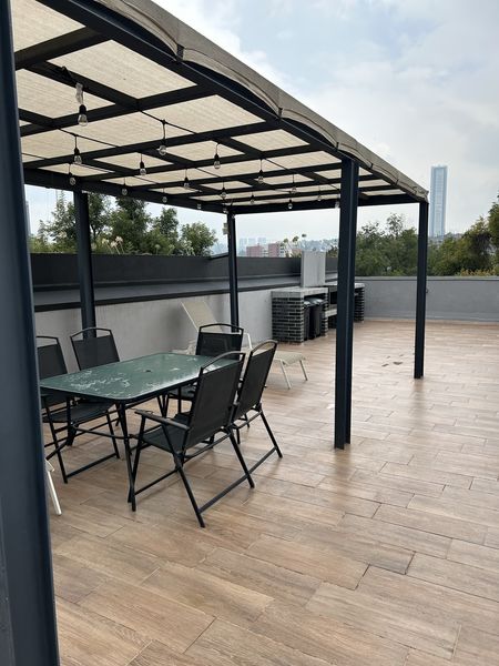 Sala, comedor , cocina abierta , dos recámaras y dos baños con canceles ., en azotea se encuentra el área de lavandería coin laundry y tendido , roof Garden con excelente vista , CCTV, vigilancia 24/7