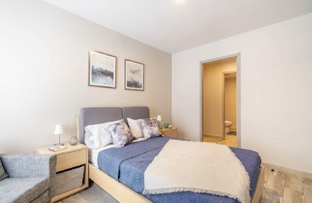 Amplios espacios con acabados de calidad, ventanas de piso a techo para gran iluminación natural, y barra de granito en cocina.
