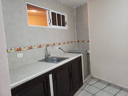 Habitación con cocina enlozada, baño y pequeño balcón.