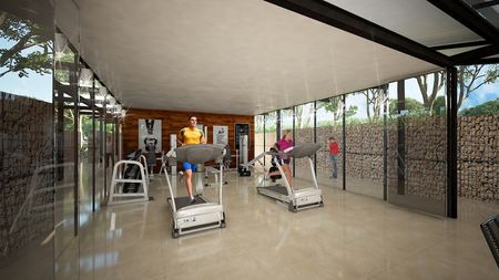 Gimnasio completamente vestido con máquinas profesionales y A/A