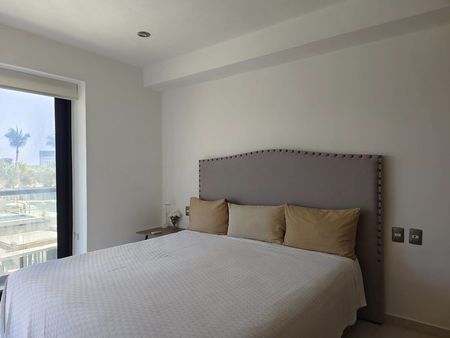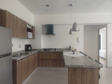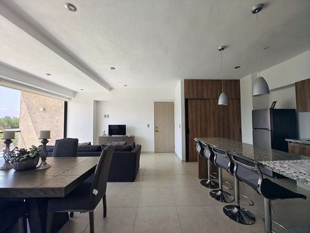 Consta de amplia sala-comedor con salida a una terraza y vista a las albercas, cocina integral con barra de granito desayunador,