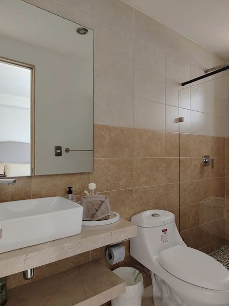 3 recámaras con clóset y aire acondicionado, provistas de black out y maya solar en los ventanales, 2 baños completos, área de lavado y dos cajones de estacionamiento.